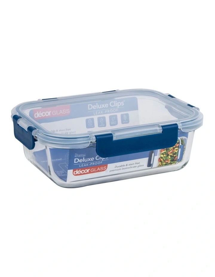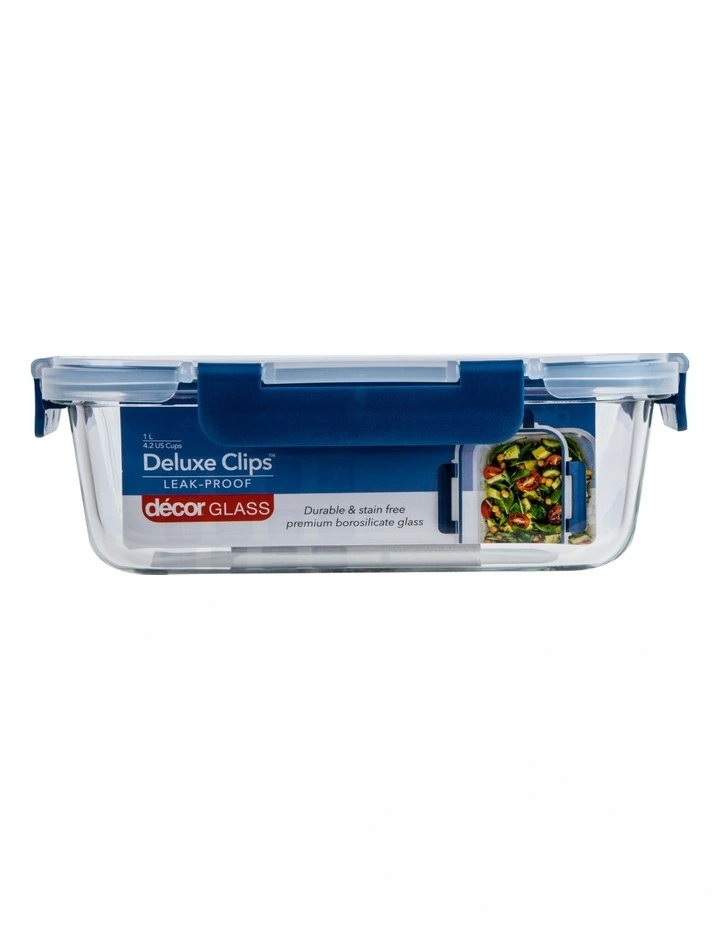 Decor Deluxe Clips 1L Glass Oblong Food Storage Blue
