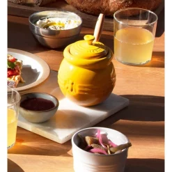 The concave cork lid allows another pot to be stacked securely on top to optimise space. The glazed ceramic base doesnt stain, stays odour free and is easy to care for. All Emile Henry products are made in France and offer a ten year guarantee.