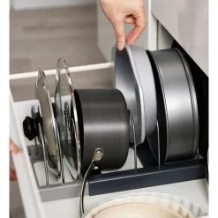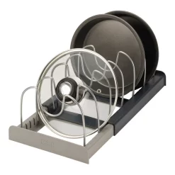 Cookware can be notoriously difficult to store, with the typical array of pans, lids and baking tins of different shapes and sizes all vying for space. This handy organiser helps make calm from the chaos by providing an adjustable rack that can fit a wide variety of awkward items. Its length can be expanded from 30.5 cm up to 56 cm and it comes with a series of scratch-proof wire dividers that can be inserted anywhere along its length, providing support and easy access to any item. Ideal for drawers or cupboards, its the perfect organisation solution for bulky cookware. Wipe clean with a damp cloth.