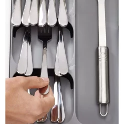 Organise messy utensil and cutlery drawers with this practical and smart storage solution. This unique tray combines five overlapping compartments for storing cutlery with three deep-sided compartments for holding utensils and gadgets. Whats usually stored in two drawers can now be neatly organised into one, creating more space in your kitchen.