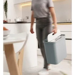 Its easy to pre-sort, store and carry recycling with this smart, compact caddy. Its divided into two 14-litre compartments allowing you to separate different types of recycling – such as glass and paper – with lids that close to hide the contents of each side. These lids, when opened together, create a handle making it very easy to transfer recycling to a larger bin kerbside or elsewhere. The two compartments can then be emptied independently by simply folding both lids to each side in turn, which traps the waste in one side as you empty the other. Capacity: 28-litreย