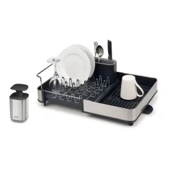This stylish set includes two highly-functional products to help make your sink-space shine. Firstly, there’s a smart dish rack with a 2-part sliding tray that allows you to easily adjust the size of your draining space when you need more room. Its coated steel prongs have non-scratch tips and can hold a variety of washing up, whilst ribs on the base help channel excess water away and prevent any from being trapped inside upturned cups or glasses.