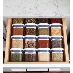 Oxo Good Grips 4 Piece Mini Pop Container Set. Stackable and space-efficient, POP Containers are designed for modular use, so you can organize in any number of height combinations to fit your countertop and pantry. Push-button mechanism creates an airtight seal with just one touch. Lids and body Dishwasher safe. Set includes 4 x 200ml Containers.